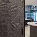 The vision for the reception area at 300 George Street was for a unique, feature wall that would not only make a statement but also address sound concerns for the open-plan office. Their solution? Zintra Emboss Panels in Tapestry to create a striking yet soft, floor-to-ceiling feature that would effectively absorb office noise. The true magic of the feature wall actually lies in the details. The installation boasts several custom elements, including a hidden sliding door that seamlessly separates the reception from the communal kitchen, sleek metal trims that accentuate the Zintra panels, and built-in features like a door handle and reception seating. The end result is a high-end reception space that's both creatively designed and functionally effective.